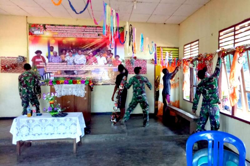 dalam menyambut perayaan Hari Natal, Satgas Pamtas RI-PNG Yonif MR 411/PDW Kostrad Pos Toray membantu warga mendekorasi dan mempercantik Gereja Persekutuan Kristen Alkitab Indonesia (GPKAI) Kampung Toray, Distrik Sota.