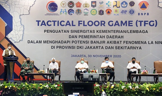 Jakarta, INDONEWS.ID --- Badan Nasional Penanggulangan Bencana (BNPB) menyelenggarakan kegiatan Tactical Floor Game (TGF) bertajuk "Penguatan Sinergitas Kementerian/Lembaga dan Pemerintah Daerah dalam Menghadapi Potensi Banjir Akibat Fenomena La Nina di Provinsi DKI Jakarta dan Sekitarnya" yang dihelat di Hotel Bidakara, Jakarta Selatan, Senin (30/11).