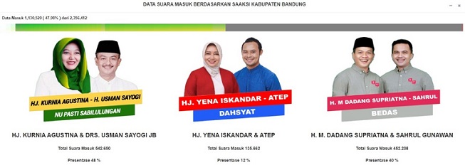 Berdasarkan hasil hitung cepat (quick count) dalam Pilkada Kabupaten Bandung menunjukkan pasangan calon (Paslon) nomor urut 3 Bupati dan Wakil Bupati, Dadang Supriatna – Sahrul Gunawan unggul sementara dalam pesta demokrasi di Kabupaten Bandung.