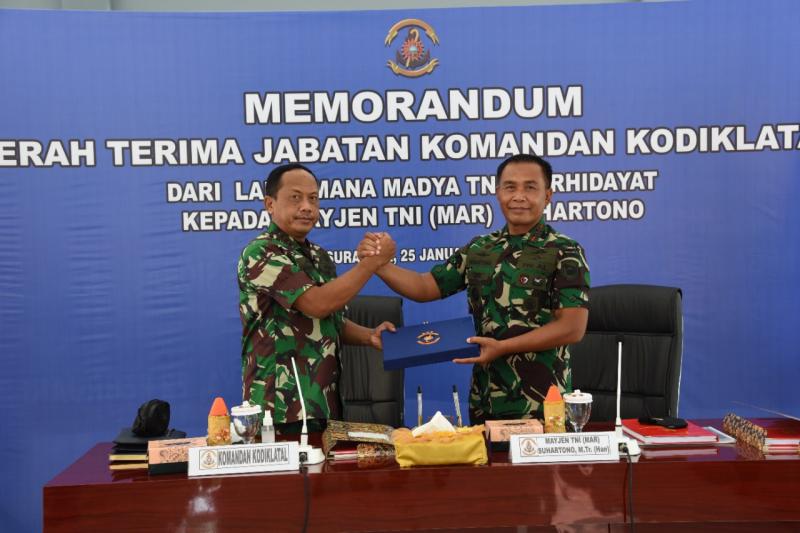 Surabaya, INDONEWS.ID -- Menjelang pelaksanaan Serah Terima Jabatan (Sertijab) Komandan Komando Pembinaan Doktrin Pendidikan dan Latihan TNI Angkatan Laut (Dankodiklatal), Dankodiklatal Laksamana Madya TNI Nurhidayat membacakan dan menyerahkan naskah memorandum Sertijab Dankodiklatal kepada calon penggantinya Mayjen TNI (Mar) Suhartono di ruang Joglo Pokgadik, Kesatrian Kodiklatal Bumimoro Surabaya, Selasa, (25/1)