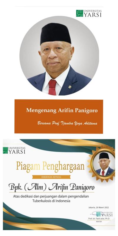 Pagi ini 26 Maret 2022 Universitas YARSI memberikan Piagam Penghargaan kepada Almarhum Bapak Arifin Panigoro, atas bakti, dedikasi dan perjuangannya yang luar biasa dalam pengendalian Tuberkulosis di Indonesia.