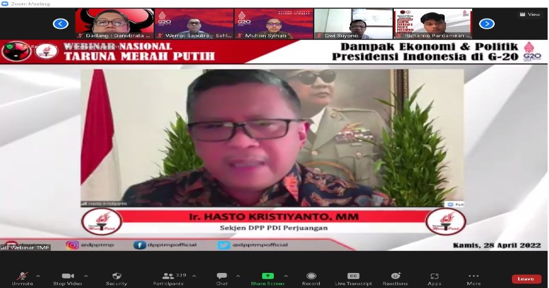 Jakarta, INDONEWS.ID - Taruna Merah Putih (TMP) menggelar Webinar Nasional dengan mengangkat tema "Dampak Ekonomi dan Politik Presidensi Indonesia di G-20", Kamis, (28/4/2022).