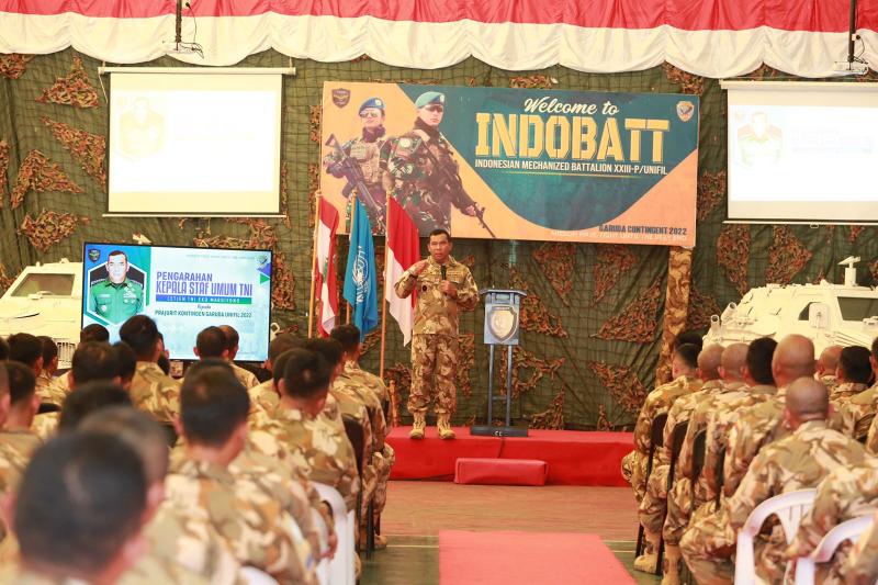 Demikian disampaikan Kasum TNI Letjen TNI Eko Margiyono kepada Prajurit TNI yang tergabung dalam Satgas Kontingen Garuda UNIFIL (United Interm Force In Lebanon), bertempat di Markas Indonesian Battalion (Indobatt) United Nations Post (UNP) 7-1 Adchit Al Qusayr, Lebanon Selatan, Jumat (23/09/2022).