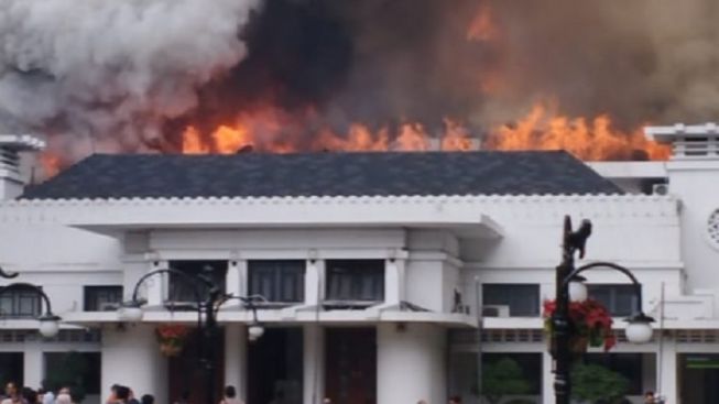 Sampai saat ini, petugas pemadam kebakaran (damkar) sedang berjibaku memadamkan kobaran apiyang terus melalap gedung di kawasan Balai Kota Bandung tersebut.