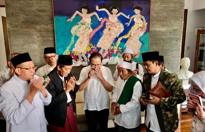 (KH. Agus Solachul Aam (Gus Aam), cucu KH. Abdul Wahab Hasbullah saat bersilaturahmi ke sahabatnya Rizal Ramli. Foto: Istimewa).