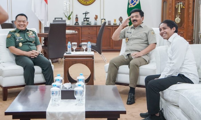 Kedua, Menteri ATR/BPN Hadi Tjahjanto dan Wakil Menteri ATR/BPN Raja Juli Antoni menerima kinjungan dari Kepala Staf Angkatan Darat (KSAD) Jendral TNI Dudung Abdurachman di Kantor Kementerian ATR/BPN, Kamis (27/4/2023)