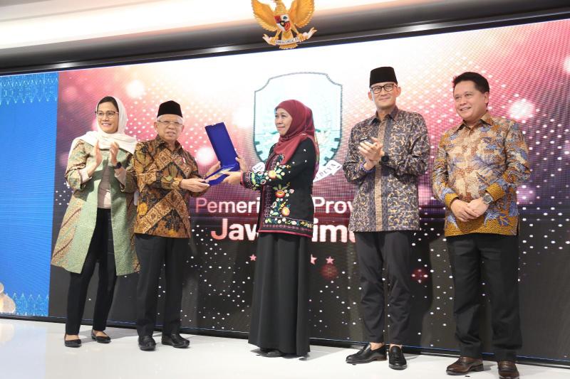 Jakarta, INDONEWS.ID - Wakil Presiden RI KH Ma’ruf Amin selaku Ketua Harian KNEKS menyerahkan memberikan langsung penghargaan kepada Gubernur Jawa Timur, Khofifah Indar Parawansa di Kantor Pusat Bank Syariah Indonesia, Jakarta Selatan. Pemerintah Provinsi Jawa Timur meraih predikat sebagai Juara Umum dalam Anugerah Adinata Syariah 2023 pada Jumat (26/5).