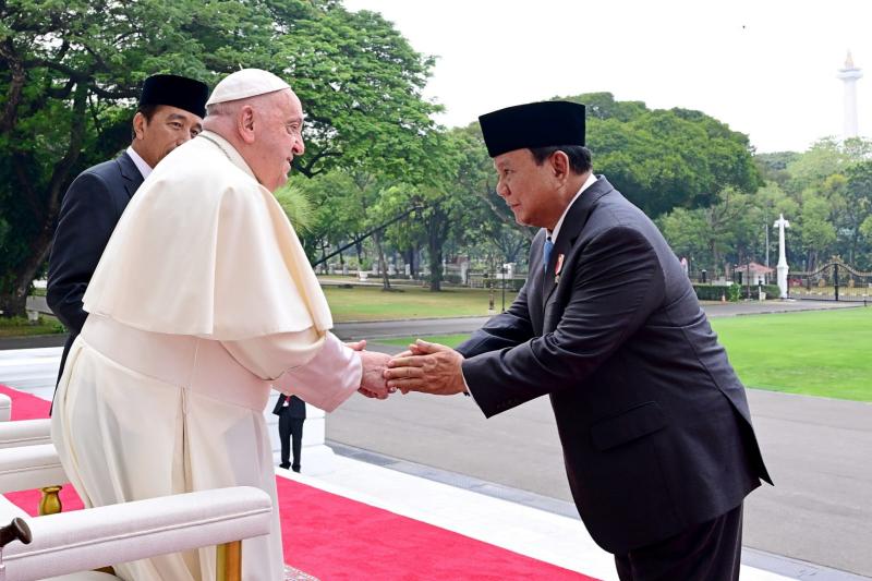 Jakarta, INDONEWS.ID - Menteri Pertahanan RI (Menhan RI) Prabowo Subianto mendampingi Presiden Joko Widodo dalam kunjungan Pemimpin Tertinggi Gereja Katolik Sedunia dan Kepala Negara Vatikan, Yang Teramat Mulia Sri Paus Fransiskus pada hari Rabu (4/9/2024), Istana Merdeka, Jakarta.