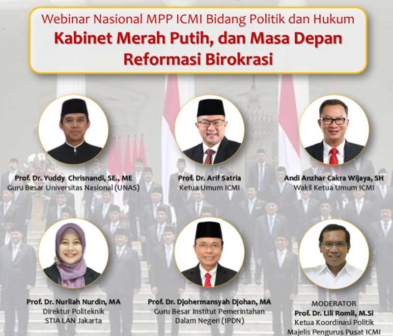 Jakarta, INDONEWS.ID - Pada Jumat, 15 November 2024, Majelis Pengurus Pusat Ikatan Cendekiawan Muslim se-Indonesia (MPP ICMI) Bidang Politik, Hukum, dan Hubungan Internasional menyelenggarakan Webinar Nasional bertajuk “Kabinet Merah Putih dan Masa Depan Reformasi Birokrasi” yang disiarkan langsung melalui platform Zoom dan kanal YouTube ICMI TV.