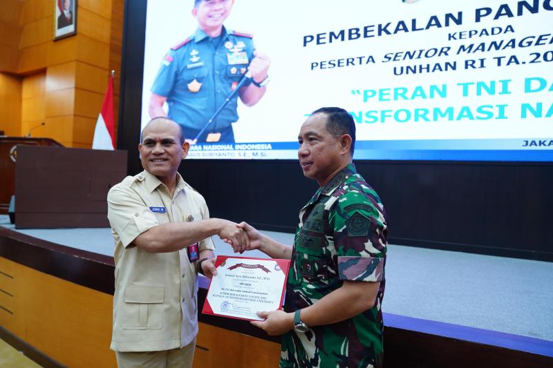 Jakarta, INDONEWS.ID - Panglima TNI Jenderal TNI Agus Subiyanto memberikan pembekalan kepada peserta Senior Management Course Unhan RI TA 2025 dengan topik "Peran TNI Dalam Transformasi Nasional" yang berlangsung di Aula Trimatra Gedung Pierre Tendean, Kementerian Pertahanan Republik Indonesia, Jakarta Pusat, Jum'at (17/1/2025).