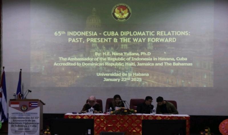 Havana, INDONEWS.ID - Hubungan Diplomatik Indonesia dan Kuba memasuki usia yang ke-65 pada tanggal 22 Januari 2025. Untuk memperingati momen bersejarah ini, KBRI Havana bekerja sama dengan Universitas Havana telah menyelenggarakan Seminar dengan tema 65th Anniversary of the Diplomatic relations of Indonesia and Cuba: Past, Present and the Way Forward, bertempat di Ampiteater Universitas Havana.