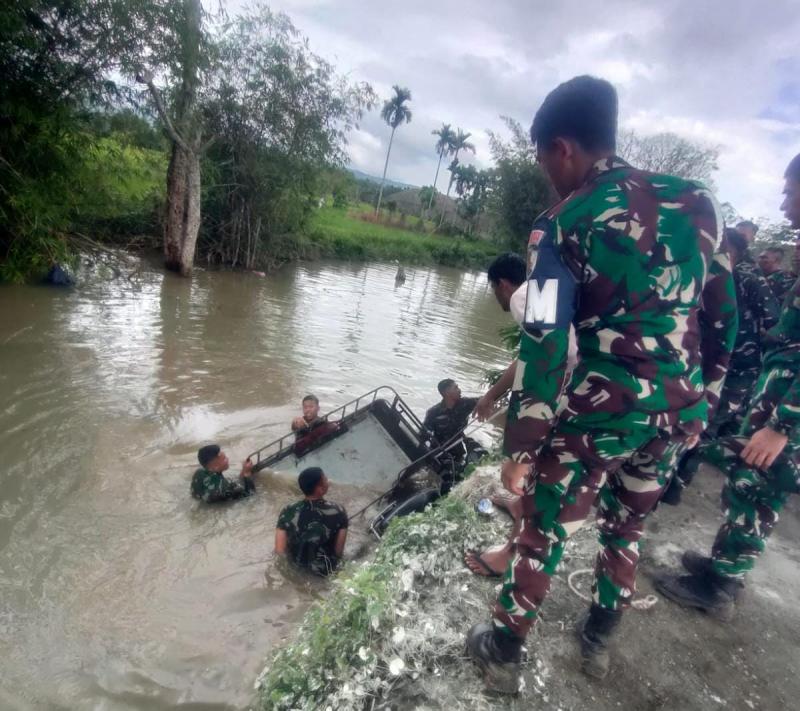 Aceh Besar, INDONEWS.ID - Personel Lanud Sultan Iskandar Muda (SIM) menunjukkan aksi heroik saat menyelamatkan empat warga Blang Bintang yang tercebur ke Sungai di pinggir jalan Lanud SIM menuju Krueng Raya.
