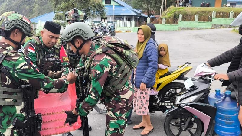 Puncak Jaya, INDONEWS.ID - Satgas Yonif 715/Mtl melaksanakan kegiatan Jum'at berkah dengan cara berbagi ta'jil kepada masyarakat Puncak Jaya yang sedang melaksanakan puasa dibulan Suci Ramadhan, walaupun sedang melaksanakan tugas di daerah rawan tidak melunturkan sedikitpun semangat personel Satgas Yonif 715/Mtl untuk berpuasa dan berbagi kepada sesama umat beragama, Jumat (28/03/2025).
