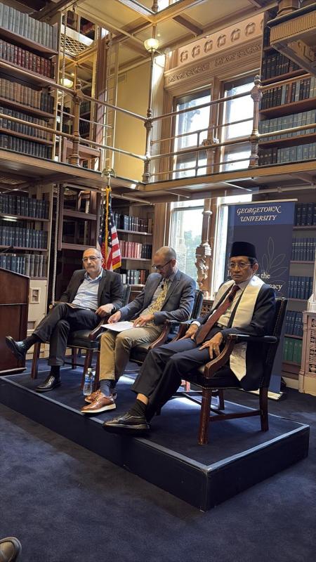 Washington DC, INDONEWS.ID - Menteri Agama Nasaruddin Umar menyampaikan visi Indonesia sebagai model dialog antaragama, perdamaian, dan keadilan sosial. Hal ini disampaikan Menag Nasaruddin dalam sebuah forum internasional di Georgetown University yang diselenggarakan oleh School of Foreign Service Institute for the Study of Diplomacy dan Alwaleed Center for Muslim-Christian Understanding, Selasa (20/5/2025).