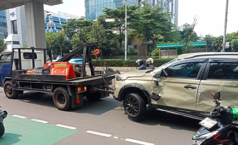 Jakarta, INDONEWS.ID - Kecelakaan lalulintas di jalan Rasuna Said, Setiabudi, Jakarta Selatan, satu satu mobil dan motor hancur dihantam pengemudi yang melaju kemcang saat menikung ke jalan tersebut dari arah Karet, Setiabudi. Meski demikian tak ada korban jiwa, namun seorang anak senpat shock akibat kendaraan yang ditumpangi terguling.
