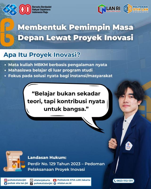 Jakarta, INDONEWS.ID – Politeknik STIA LAN Jakarta terus membuktikan komitmennya dalam mencetak lulusan yang adaptif, inovatif, dan berdampak nyata bagi masyarakat. Salah satu program unggulan yang menjadi manifestasi dari kebijakan Merdeka Belajar Kampus Merdeka (MBKM) adalah Proyek Inovasi, sebuah mata kuliah yang mengintegrasikan pembelajaran di luar kelas dengan penyelesaian masalah di lapangan.