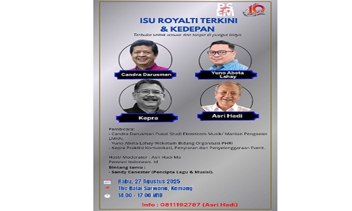 Jakarta, INDONEWS.ID-Media online berbasis di Jakarta, INDONEWS.ID menanggapi isu royalti yang lagi ramai diperbincangkan di berbagai media dengan menggelar acara diskusi publik.