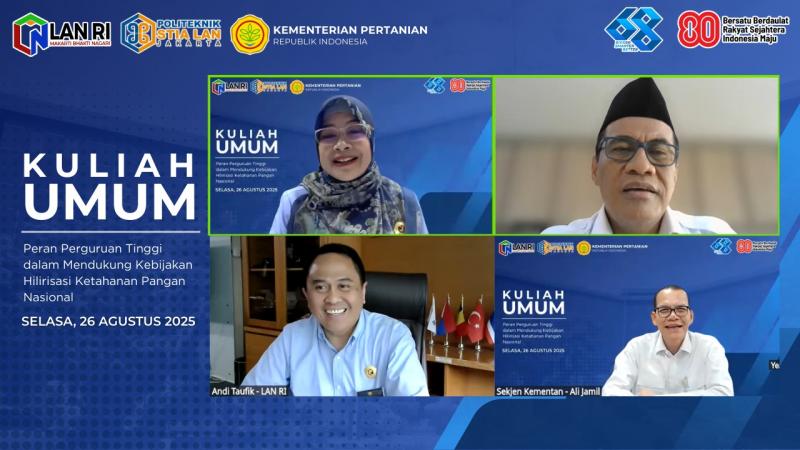 Jakarta, INDONEWS.ID - Upaya memperkuat ketahanan pangan nasional melalui peran aktif perguruan tinggi menjadi sorotan dalam kuliah umum yang digelar Politeknik STIA LAN Jakarta, Selasa (26/8/2025). Dengan mengangkat tema “Peran Perguruan Tinggi dalam Mendukung Kebijakan Hilirisasi Ketahanan Pangan Nasional”. Kegiatan ini dilaksanakan secara daring melalui platform Zoom Meeting dan disiarkan langsung melalui kanal YouTube resmi Politeknik STIA LAN Jakarta.