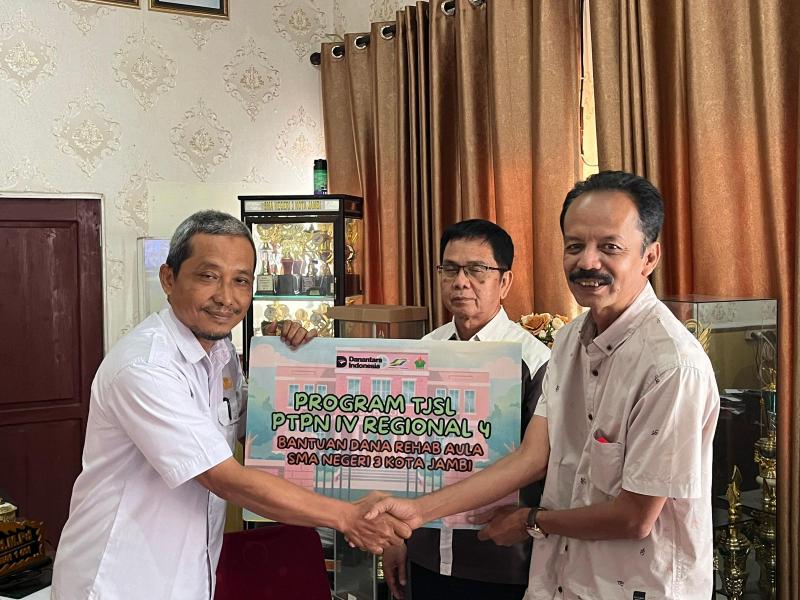 Jambi, INDONEWS.ID - PT Perkebunan Nusantara (PTPN) IV Regional 4 Jambi, terus realisasikan program Tanggung Jawab Sosial Lingkungan (TJSL) bidang pendidikan. Kali ini, giliran aula SMA Negeri 3 kota Jambi yang direhab dan furniture diganti terbaik agar peserta didik di SMA Negeri favorit ini dapat mengikuti proses belajar mengajar dengan tenang dan nyaman hingga materi pelajaran yang diberikan terserap maksimal.