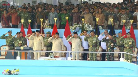 Jakarta, INDONEWS.ID - Presiden Prabowo Subianto memimpin upacara HUT TNI ke 80 di Silang Monas Jakarta, Minggu (5/10/2025). Presiden juga didampingi oleh Menhan RI Syafry Syamsudin, Panglima TNI Jenderal TNI Agus Subiyanto, Kasad Jenderal TNI Maruli Simanjuntak, Laksamana TNI Muhammad Ali, Kasau Marsekal TNI Mohamad Tonny Harjono, dan pejabat tinggi lainnya serta para purnawirawan TNI diantaranya Jenderal (Purn) TNI Try Sutrisno.