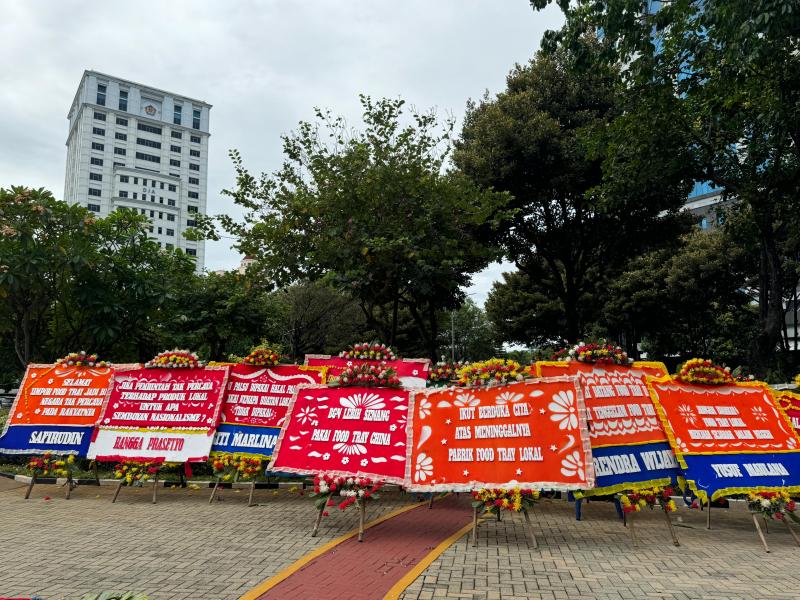 "Selamat food tray China Berjaya, produsen Food Tray lokal jadi penonton," tulis seorang atas nama Rudi Santoso di papan bunganya.