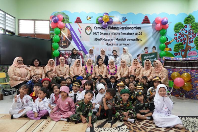 Dalam upaya mendukung pembangunan SDM unggul sejak dini, Dharma Wanita Persatuan (DWP) Kementerian Koordinator Bidang Perekonomian menyelenggarakan kegiatan DWP Mengajar yang mengangkat tema “Mendidik dengan Hati, Menginspirasi Negeri” di TK Negeri Cempaka Putih 01, Jakarta, Selasa (18/11). Kegiatan ini sekaligus menjadi momen peringatan Hari Ulang Tahun ke-26 DWP Kemenko Perekonomian.