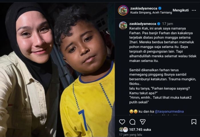 Kunjungan Zaskia ke Aceh Tamiang pada Rabu (4/12/2025) malam juga meninggalkan jejak kemarahan dan keprihatinan. Melalui unggahan Instagram, ia mengecam pihak-pihak yang menggunduli hutan demi keuntungan pribadi.