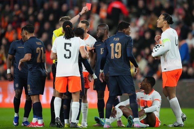 Kartu meraih lantaran ia menjatuhkan Plata dari belakang di tepi kotak penalti. Sejak menit 12, Belanda harus bermain dengan 10 orang.