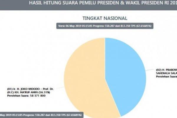 Jakarta, INDONEWS.ID - Komisi Pemilihan Umum (KPU) kembali merilis hasil real count sementara, Senin (6/5/2019), pasangan calon nomor urut 01, Joko Widodo-Maruf Amin masih bertengger diurutan pertama dengan memperoleh 56,29 persen suara, sedangkan paslon nomor urut 02 memperoleh 43,71 suara.