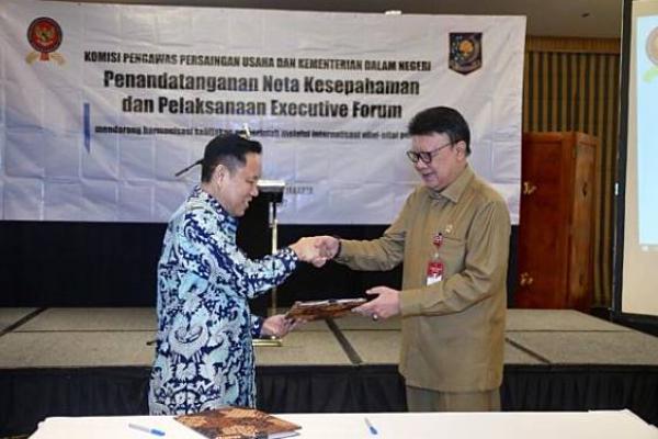 guna mengawasi pengadaan barang dan jasa agar terhindar dari perilaku korupsi, Kementerian Dalam Negeri (Kemendagri) dan Komisi Pengawasan Persaingan Usaha (KPPU) menandatangani nota kesepahaman (MoU), di Hotel Aryaduta, Jakarta, Senin (1/7/2019).