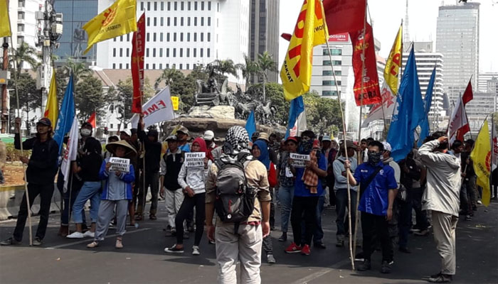 Jakarta, INDONEWS.ID - Massa aksi unjuk rasa yang berasal dari para buruh, tani, hingga mahasiswa kembali memadati jalan Medan Merdeka Barat, Jakarta Pusat, Senin (30/9/2019). Banyaknya jumlah massa yang turun membuat jalan dari arah Jalan Sudirman menunju Istana Merdeka dan sebaliknya ditutup.