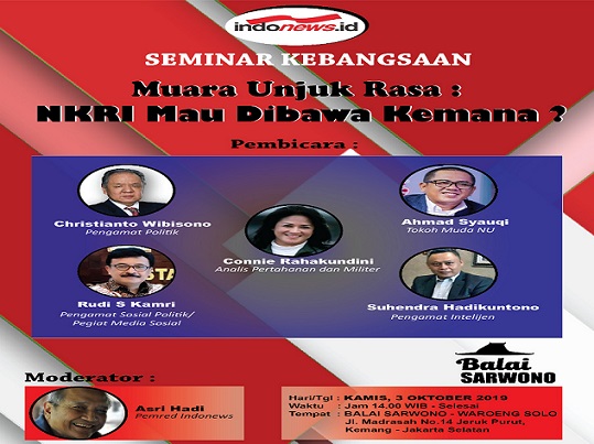 Untuk mencari solusi terbaik atas hal tersebut, Indonews akan mengadakan Seminar Kebangsaan yang mengambil tema “Muara Unjuk Rasa: NKRI Mau Dibawa Ke Mana?”. Seminar akan diadakan pada Kamis, 3 Oktober 2019 pukul 15.30 dan terbuka untuk umum.