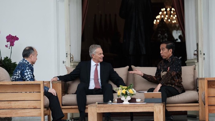 Tony Blair dan Masayoshi Son hadir di kompleks Istana Kepresidenan sekitar pukul 15.00 WIB. Keduanya langsung diarahkan bertemu Jokowi di Istana Negara.