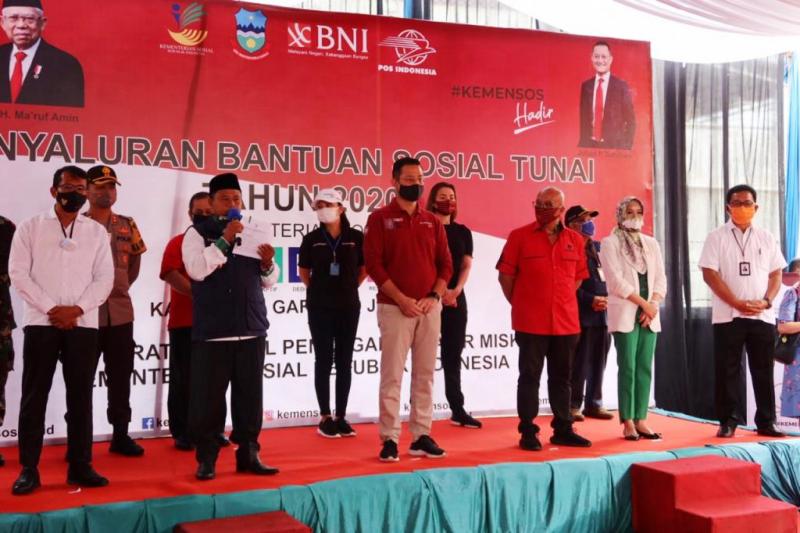 Menteri Sosial (Mensos) Juliari P Batubara meninjau penyaluran BST tahap III di Kabupaten Garut, Jawa Barat, pada Jumat, (19/6/2020)