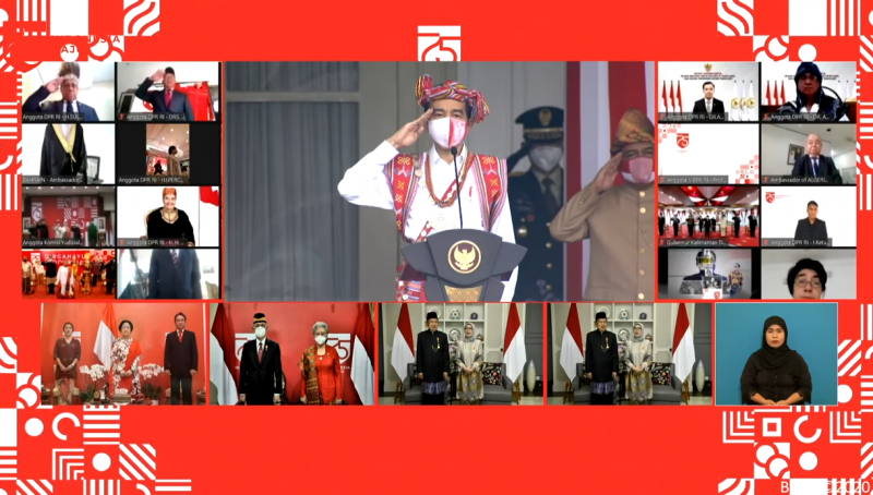 Seluruhnya mengenakan masker dan mengikuti protokol kesehatan untuk mencegah penyebaran COVID-19. Sementara Presiden dan Wakil Presiden Republik Indonesia terdahulu mengikuti jalannya upacara secara virtual dari kediaman masing-masing.*