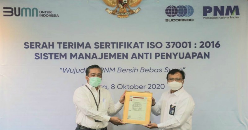 PT Permodalan Nasional Madani (Persero) atau PNM menerima sertifikat ISO 37001:2016 Sistem Manajemen Anti Penyuapan (SMAP) dari PT Sucofindo (Persero) pada Kamis (8/10/2020) di Menara Taspen.