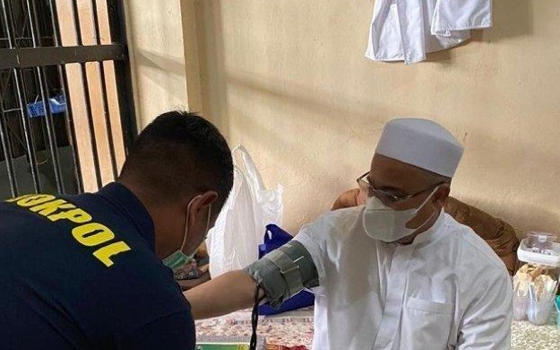 Berdasarkan foto yang beredar di media sosial, kepala plontos HRS terlihat saat petugas melakukan pemeriksaan kesehatan kepada dirinya.