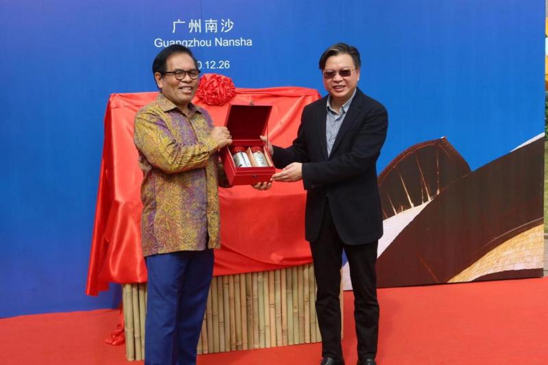 Duta Besar RI Bapak Djauhari Oratmangun didampingi Konsul Jenderal RI di Guangzhou (Bapak Gustanto), pejabat distrik Nansha, dan pemilik taman burung memotong pita serta membuka tirai papan nama, menandai peresmian Paviliun Indonesia, pada Sabtu, 26 Desember 2020.