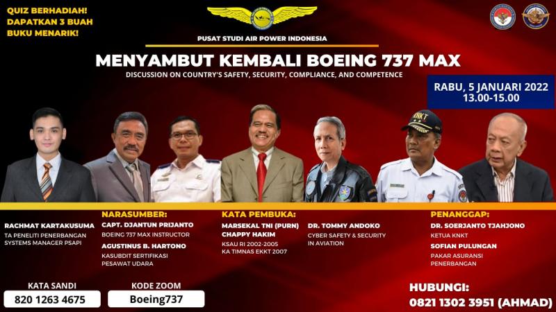 Jakarta, INDONEWS.ID - PSAPI sebagai lembaga pusat pembelajaran penerbangan Indonesia kembali memulai acara webinar nya pada 5 Januari 2022, Webinar via zoom tersebut dihadiri oleh Marsekal TNI (PURN) Chappy Hakim - Chairman Indonesia Center for Air Power Studies, Capt. Djantun Prijanto - Boeing 737 MAX Instructor, Agustinus B. Hartono - Kasubdit Sertifikasi Pesawat Udara, DR. Tommy Andoko - Cyber Safety & Security In Aviation, DR. Soerjanto Tjahjono - Ketua KNKT, Sofian Pulungan - Pakar Asuransi Penerbangan.