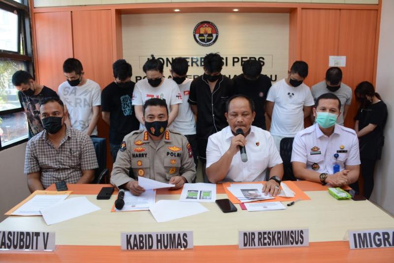 Batam, INDONEWS.ID – Sebanyak 10 orang tersangka terdiri dari 1 orang perempuan dan 9 orang laki-laki tersebut berwarga Negara China dan Vietnam yang berinisial TTP, LH, MXJ, ZW, ZCG, LYW, TXQ, MTY, WB, dan MXW berhasil diamankan oleh Dit Reskrimsus Polda Kepri atas dugaan Tindak Pidana Penipuan Dan Pemerasan Dengan Modus Sex Phone di Kota Batam, hal tersebut disampaikan oleh Kabid Humas Polda Kepri Kombes Pol Harry Goldenhardt S., S.IK., M.Si., didampingi Dir Reskrimsus Polda Kepri Kombes Pol Teguh Widodo, S.I.K., bertempat di Media Center Bid Humas Polda Kepri. Kamis (6/1/22).