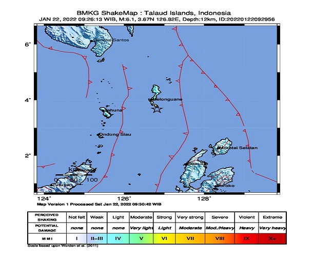 Jakarta, INDONEWS.ID -- Gempa bumi dengan magnitudo (M)6,1 terjadi pada Sabtu (22/1), sekitar pukul 09.26 WIB. Fenomena tersebut memicu guncangan kuat yang dirasakan warga Kepulauan Sangihe dan Kepulauan Talaud, Provinsi Sulawesi Utara.