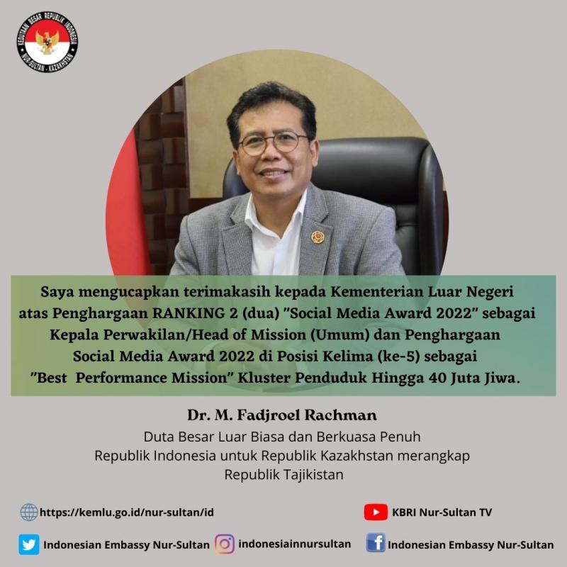 Dr. Mochamad Fadjroel Rachman Duta Besar Luar Biasa dan Berkuasa Penuh Republik Indonesia untuk Republik Kazakhstan merangkap Republik Tajikistan mengucapkan terimakasih kepada Kementerian Luar Negeri atas Penghargaan rangking 2 (dua) sebagai Kepala Perwakilan/Head of Mission (Umum) dan di posisi kelima (ke-5) sebagai “Best Performance Mission” Kluster Penduduk Hingga 40 Juta Jiwa.