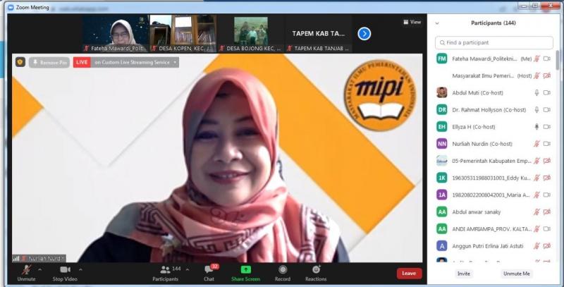 Selain Prof. Dr. Nurliah Nurdin, MA., Direktur Politeknik STIA LAN Jakarta/ Dewan Pakar MIPI, webinar ini juga menghadirkan Prof. Dr. Abdul Muti, M.Ed., selaku Sekretaris Umum Pengurus Pusat Muhammadiyah, dan Ray Rangkuti, dari Lingkar Madani Indonesia. Webinar ini ditutup dengan pemaparan dari Sekjen Masyarakat Ilmu Pemerintahan Indonesia Bahar Thahir.