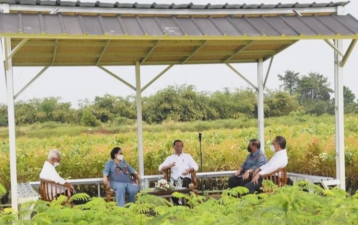 Bogor, INDONEWS. ID - Presiden Joko Widodo bersama Presiden ke-5 RI sekaligus Ketua Dewan Pengarah BRIN, Megawati Soekarnoputri, Sekretaris Kabinet Pramono Anung, dan Dewan Pengarah BRIN Bambang Kesowo meninjau langsung Persemaian Modern Rumpin, di Kecamatan Rumpin, Kabupaten Bogor Kamis (10/3/2022).