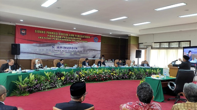 (Sidang Promosi Doktor Ilmu Pemerintahan, Program Pascasarjana Institut Pemerintahan Dalam Negeri, dengan Promovendus S. Aminuddin, di Kampus IPDN Jakarta, Selasa (24/5/22).