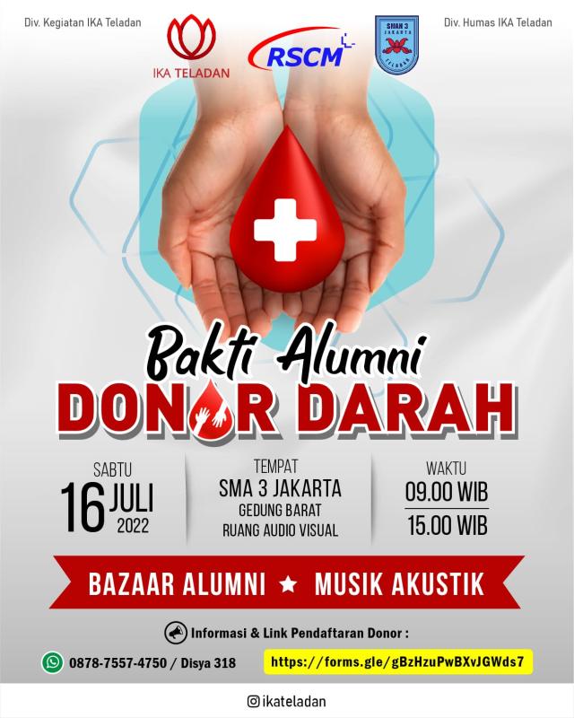 Giat donor darah yang terbuka bagi Alumni Teladan & Umum, juga ada acara menarik lainnya Bazar Alumni & Musik Akustik.