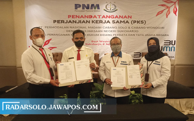 PT Permodalan Nasional Madani atau PNM Cabang Solo dan Cabang Wonogiri menandatangani kerja sama dengan Kejaksaan Negeri (Kejari) Sukoharjo, Rabu (6/7). Salah satu poinnya yakni bantuan hukum dalam penyelesaian bidang perdata dan tata usaha negara.