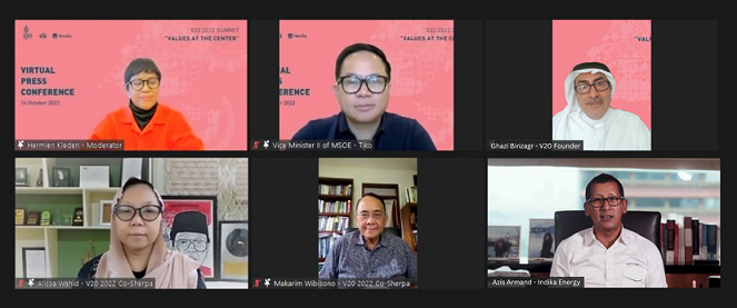 Mereka adalah Wakil Menteri BUMN Kartika Wirjoatmodjo, co-Sherpa V20 2022 Prof.Dr. Makarim Wibisono dan Alissa Wahid, Wakil Presiden Direktur dan CEO Group Indika Energy Aziz Armand dan Pendiri V20 Global serta anggota Dewan Syuro Kerajaan Arab Saudi, Dr. Ghazi Binzagr.