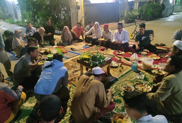 Warga duduk bersila memenuhi jalan utama yang berada di perumahan tersebut. Acara ditandai dengan pemotongan pita dan tumpeng.