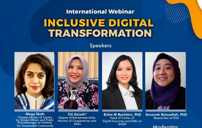 Demikian diungkapkan oleh Peneliti INDEF, Eisha Maghfiruha Rachbini dalam seminar internasional bertajuk “Inclusive Digital Transformation”. Seminar ini diselenggarakan oleh INDEF berkerja sama dengan Ford Foundation, pada Kamis (8/12).